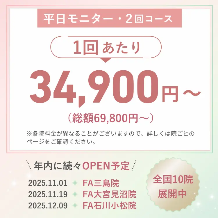 最終施術より2ヶ月以内かつ、同じ担当者に限り、1回のみ22,000円でリタッチを受けられます。