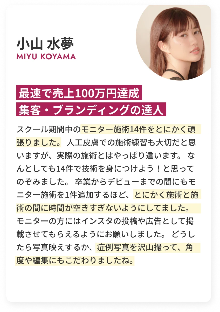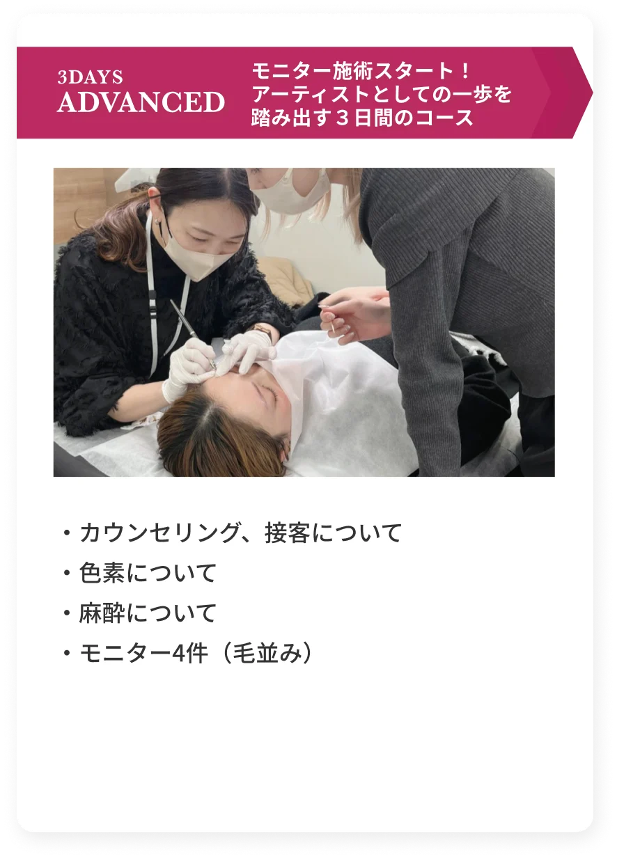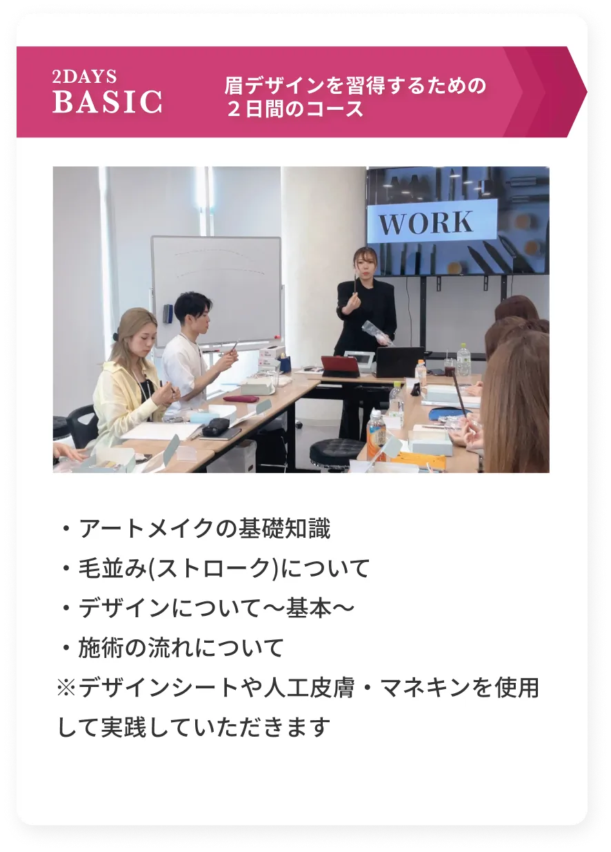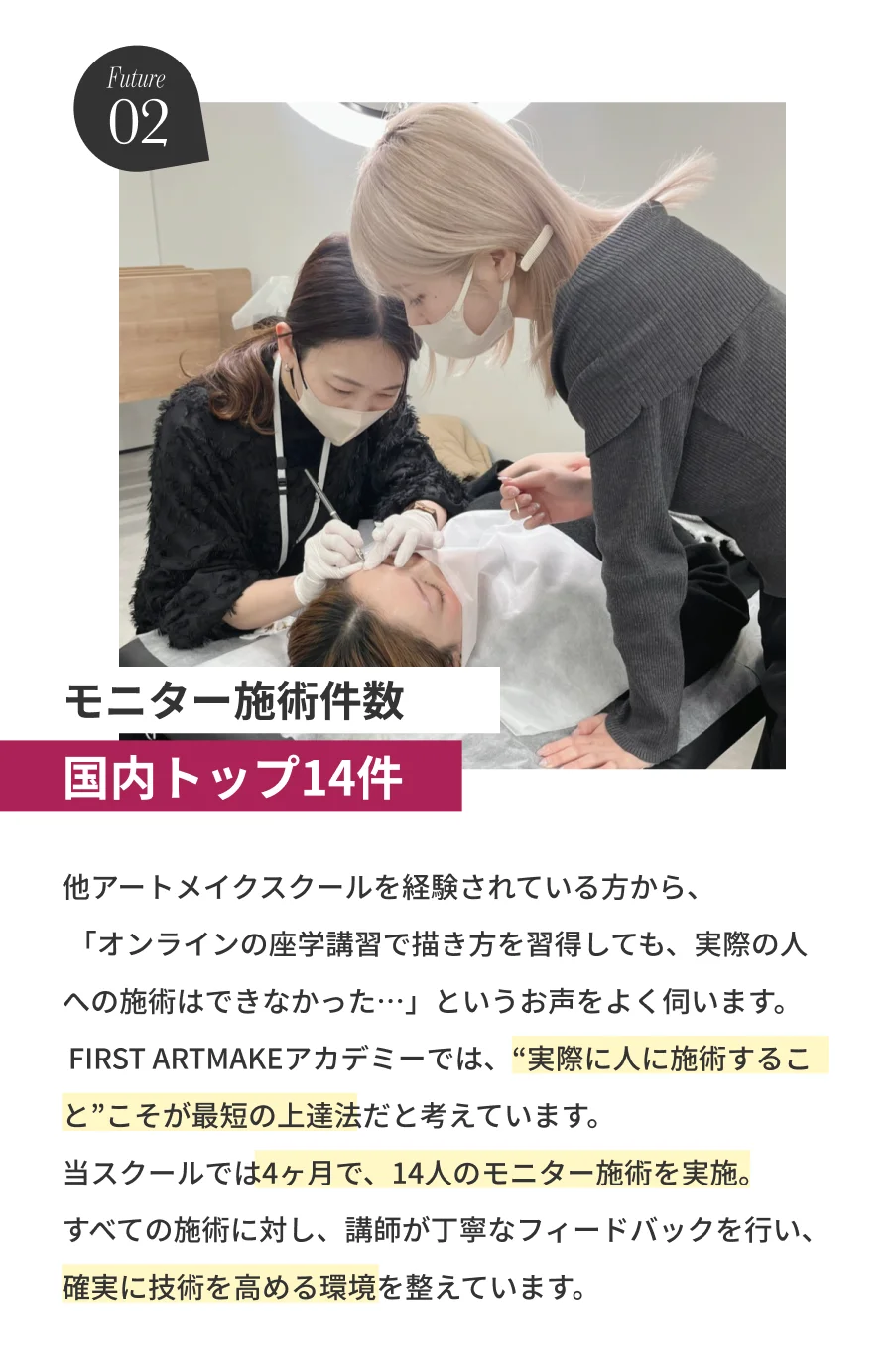 アーティストとして活躍できることを前提としたカリキュラムをつくり、全くの未経験者でも安心して学び、実践を通じてプロの技術と接客力を身につけられるスクール環境を整えました。