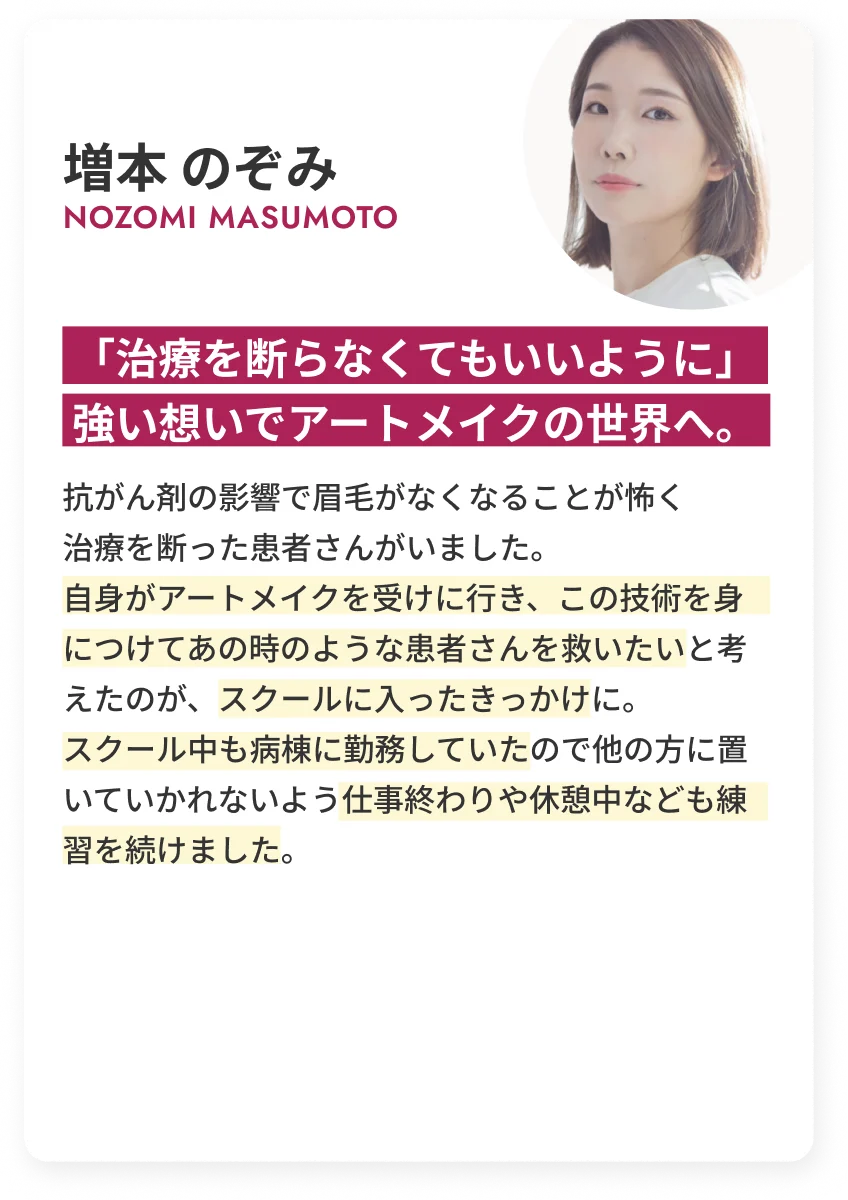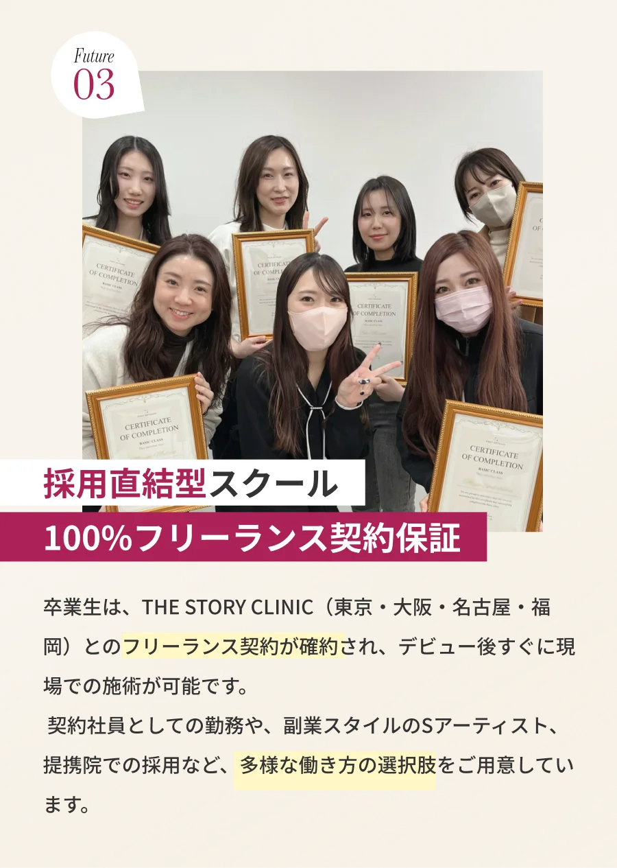 所属を希望されない場合でも、Professional卒業後、SアーティストとしてFIRST ARTMAKEを運営するTHE STORY CLINIC(東京・銀座)と100%フリーランス契約を結べます。