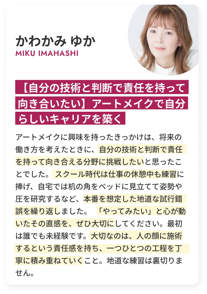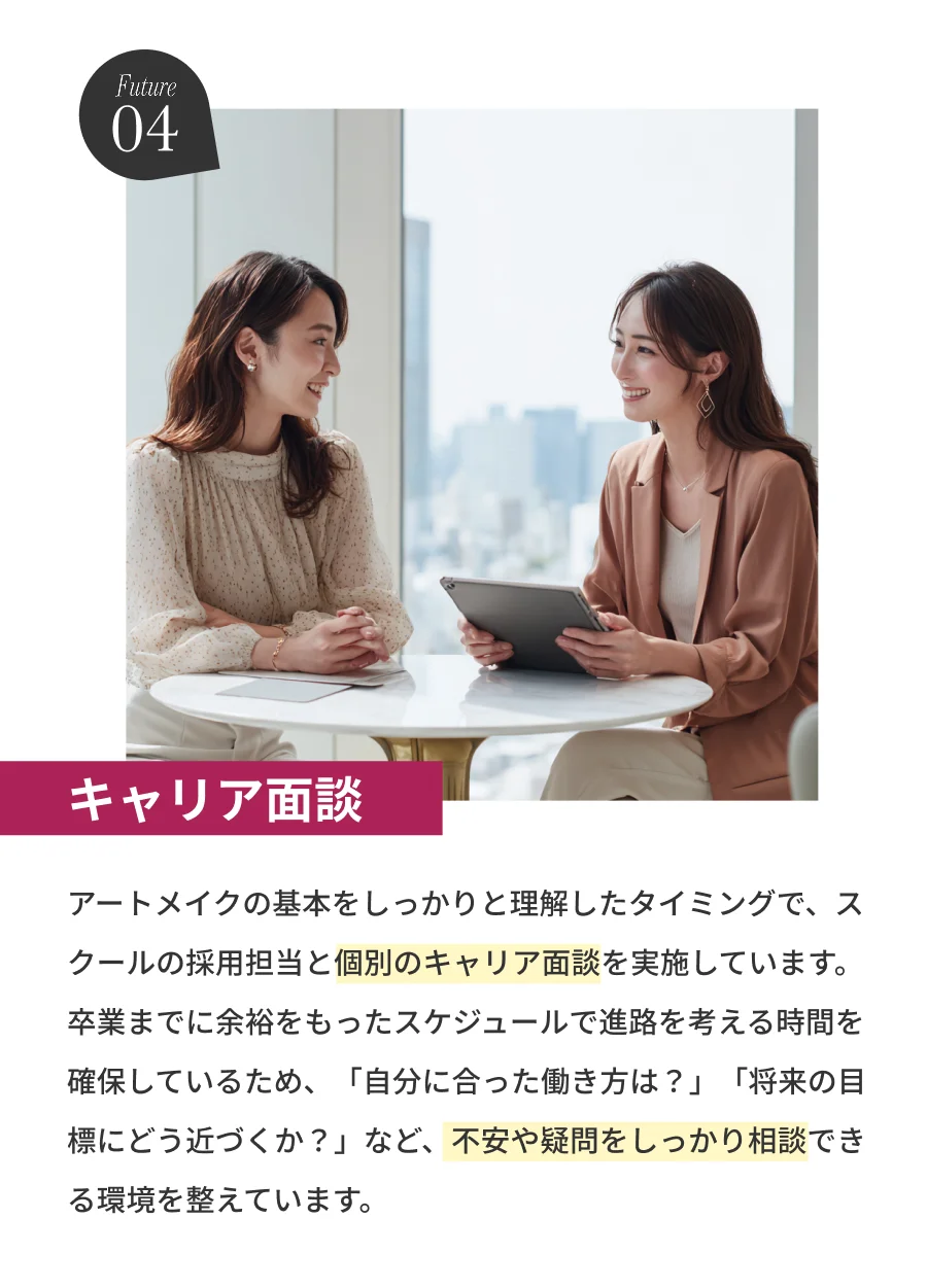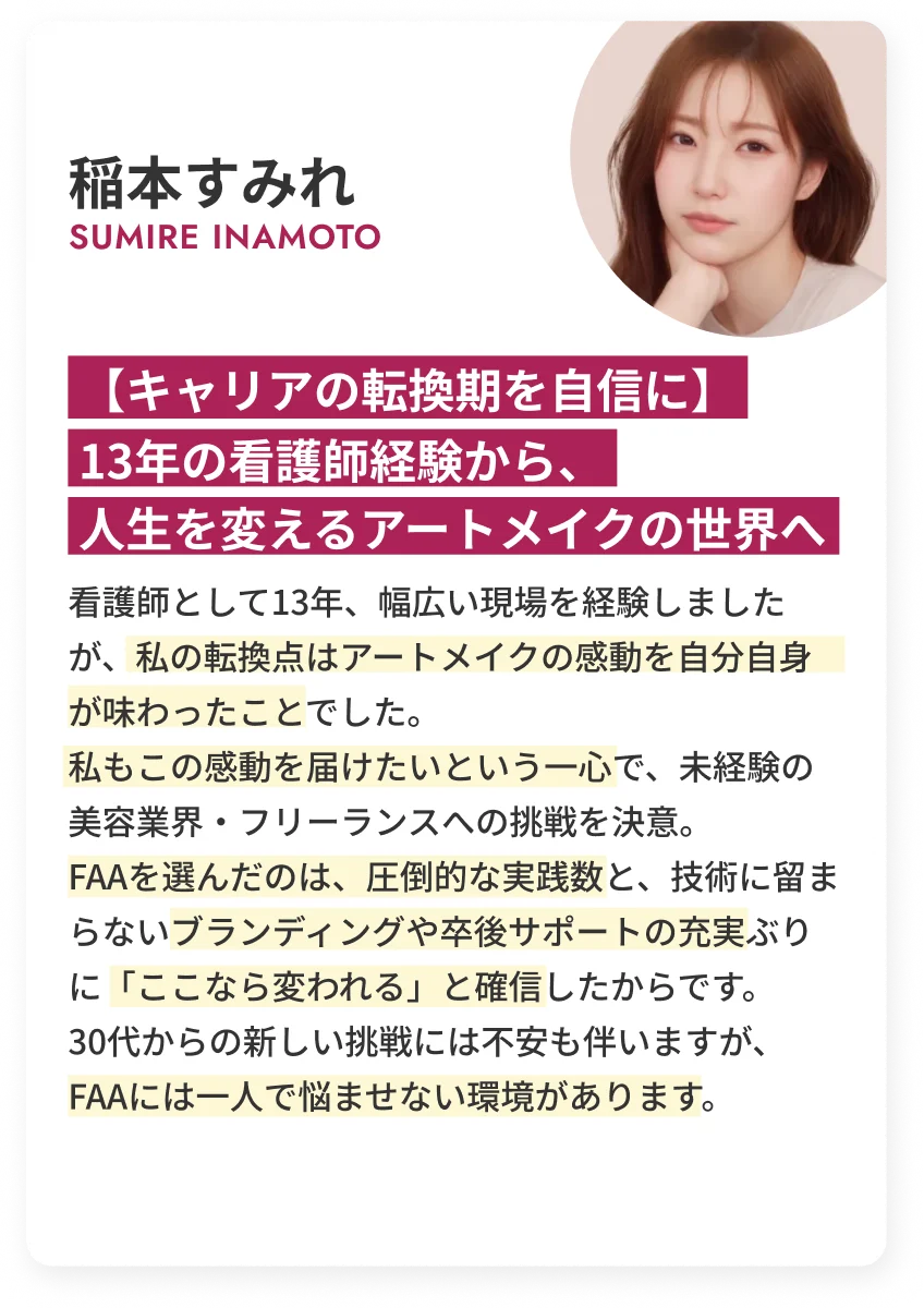 FIRST ARTMAKE 所属アーティスト / Sアーティスト / 提携院への就職 などライフスタイルに合わせた働き方をご用意しております。 - Q7.