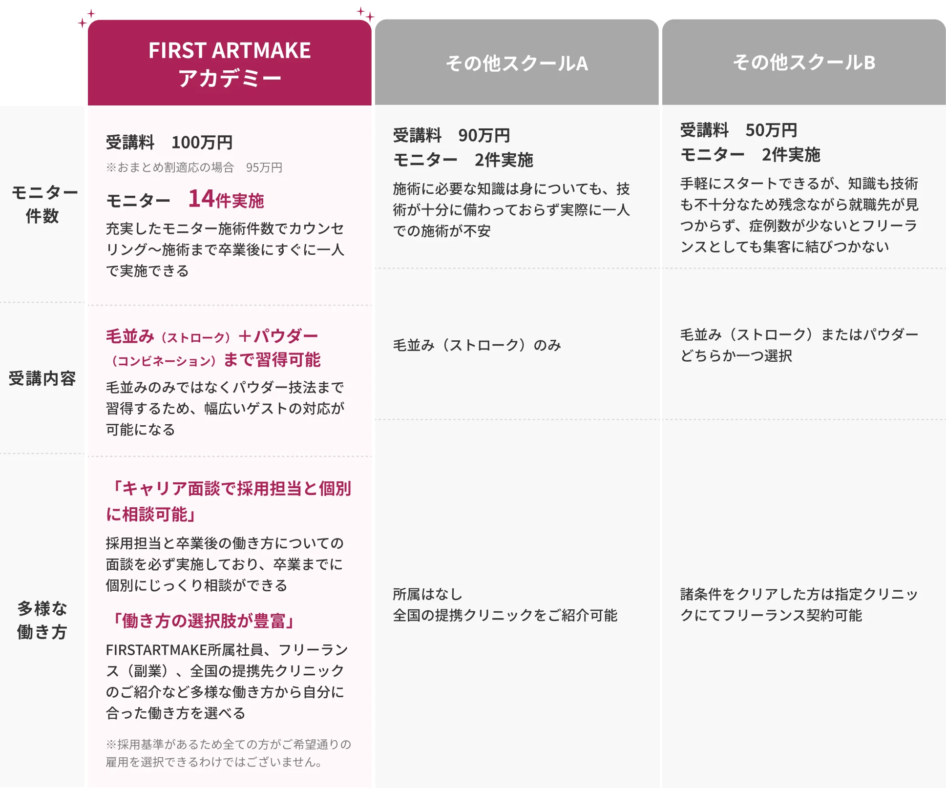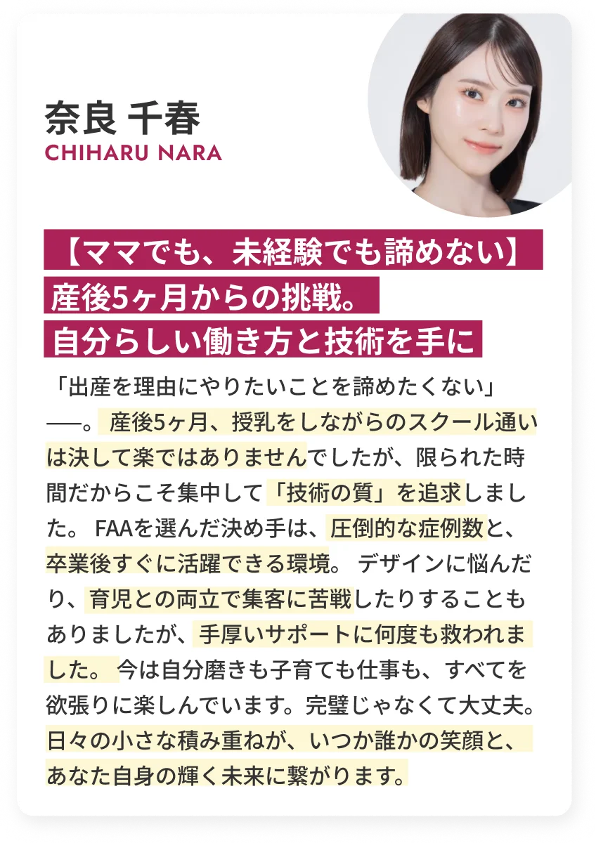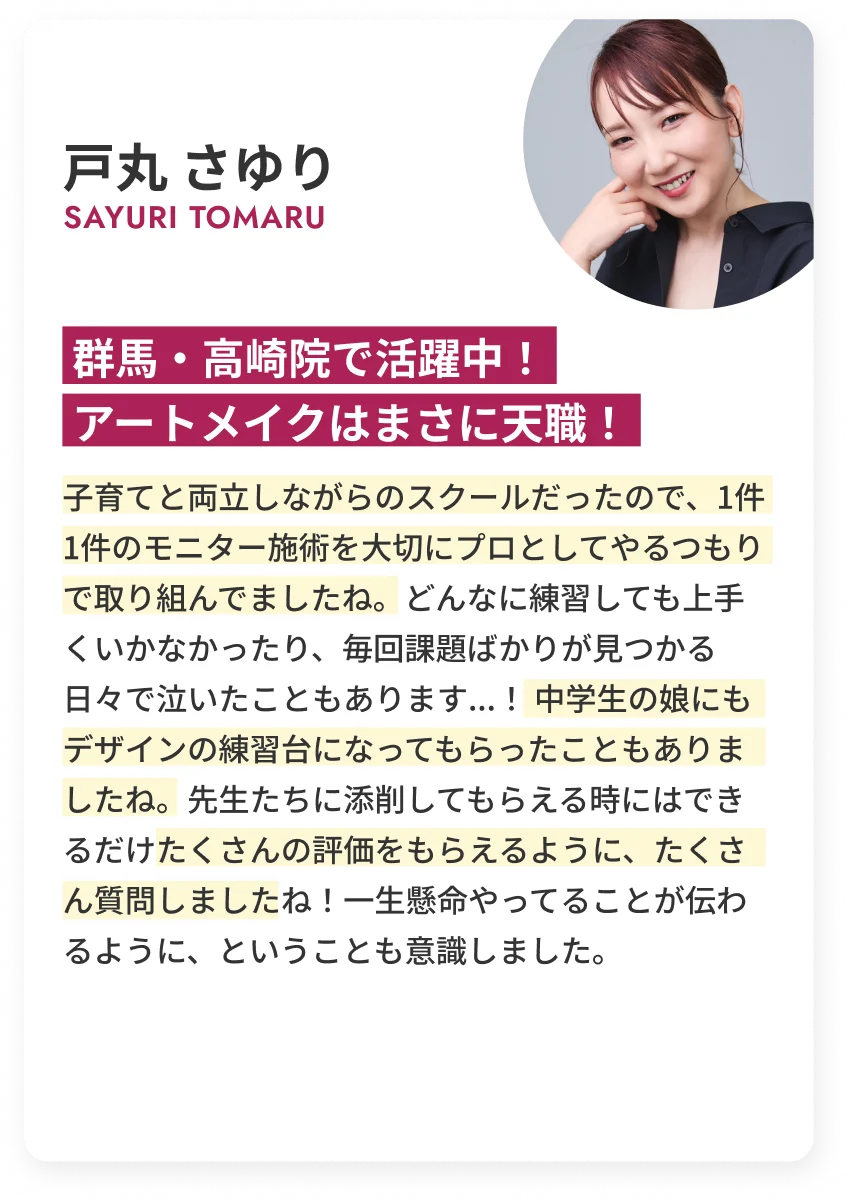 FIRST ARTMAKE 所属アーティスト / Sアーティスト / 提携院への就職 などライフスタイルに合わせた働き方をご用意しております。 - Q7.